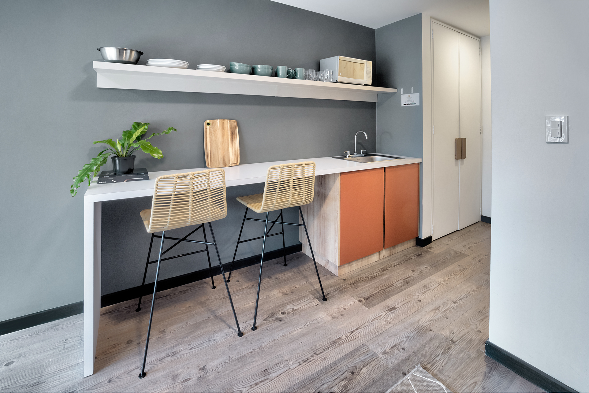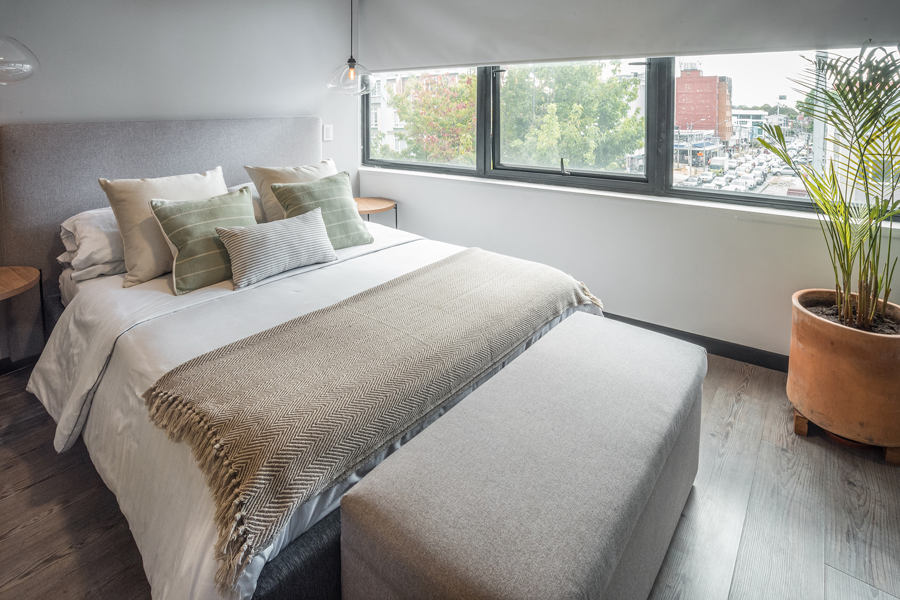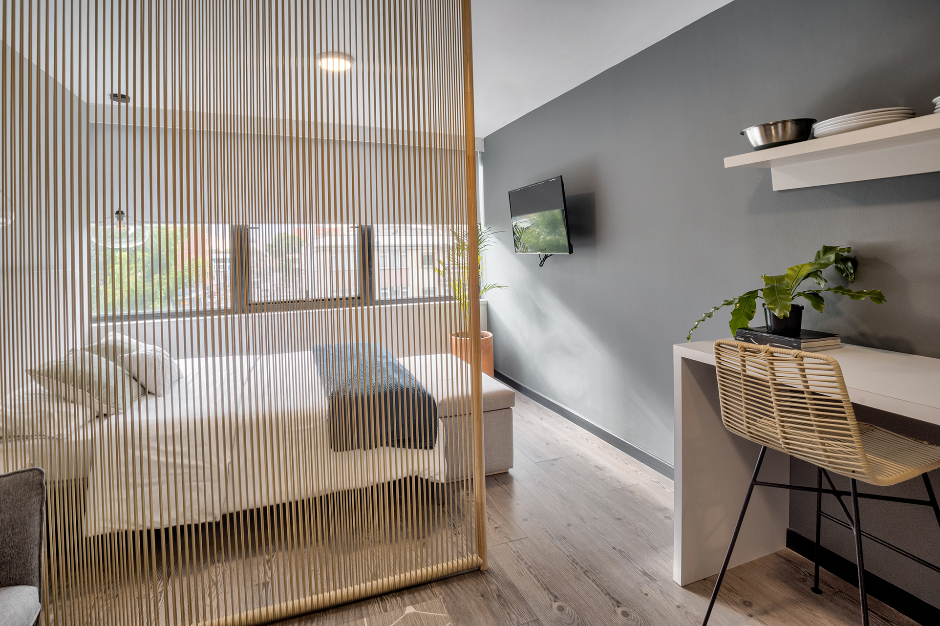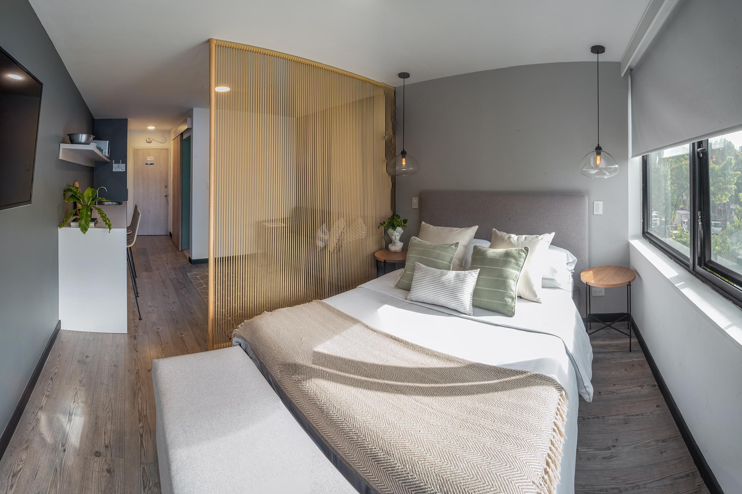 La paleta de colores neutros, compuesta por grises suaves, blancos y tonos de madera clara, aporta calma y continuidad entre los ambientes. El elemento central del proyecto es el divisor en listones verticales de madera, que separa el dormitorio sin bloquear la luz ni la conexión visual, equilibrando privacidad y apertura. La iluminación cálida y los textiles suaves refuerzan la atmósfera acogedora, reflejando el enfoque de minn en diseñar espacios funcionales, atemporales y pensados para ser vividos.
