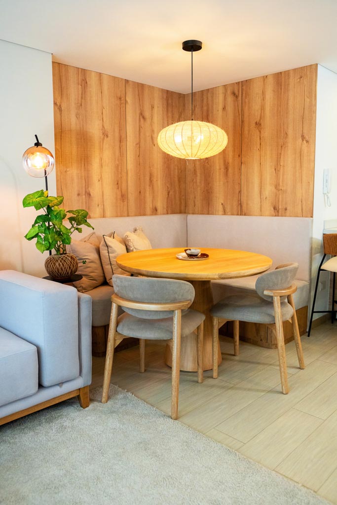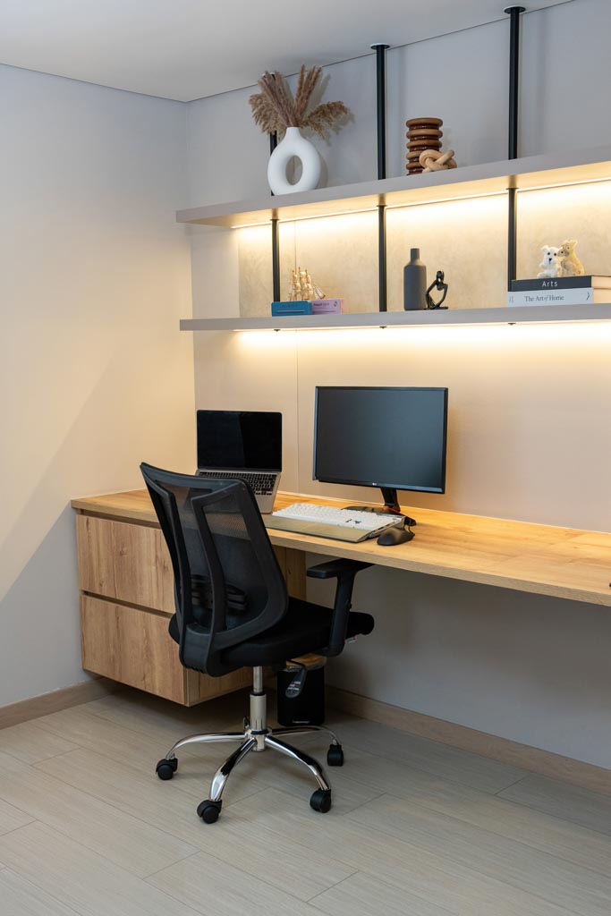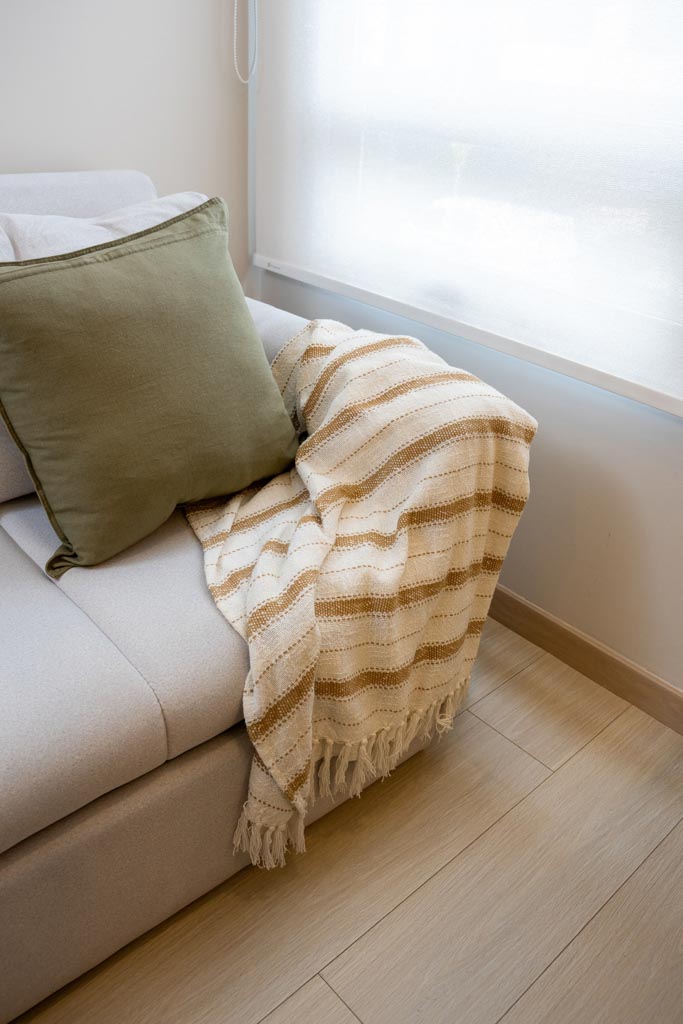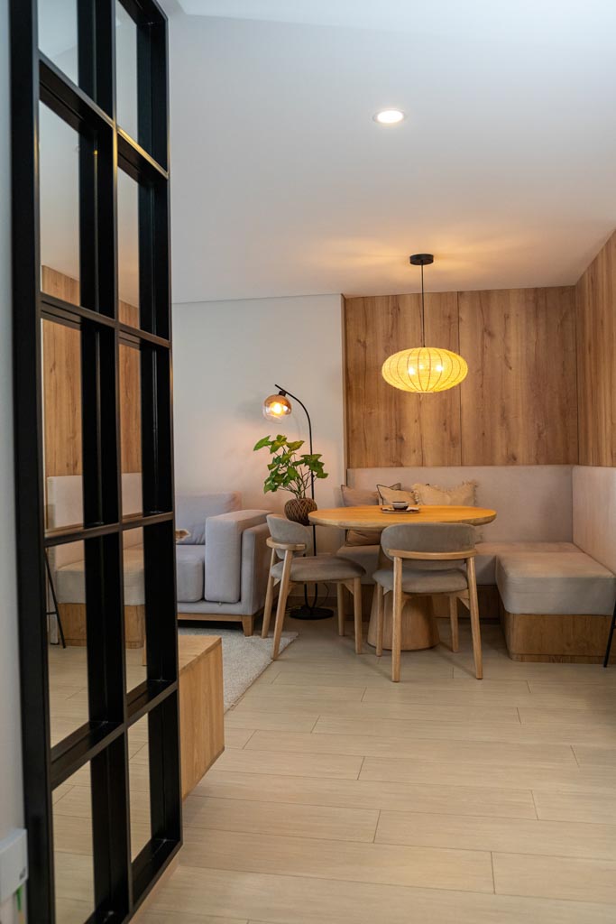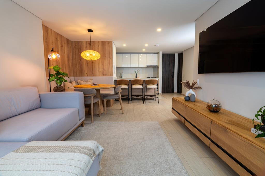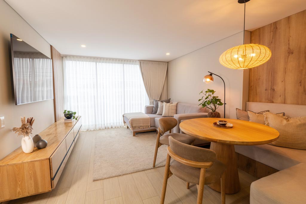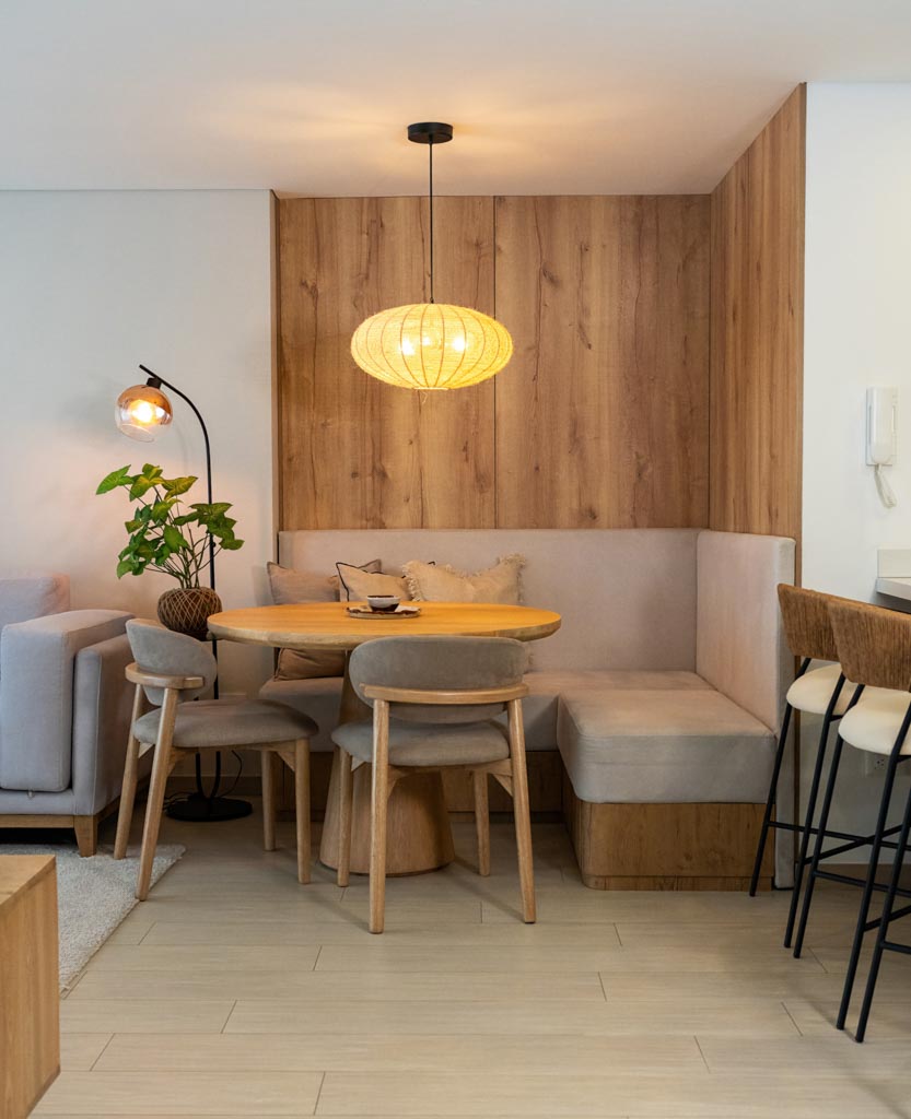 Este proyecto de diseño interior residencial fue creado para aprovechar cada metro del espacio, combinando funcionalidad y calidez. La luz natural se filtra suavemente a través de las cortinas, resaltando los tonos neutros y las texturas suaves del mobiliario. La madera natural en paredes y muebles aporta una sensación acogedora, mientras que los tejidos y cojines en lino completan una atmósfera relajada y hogareña. Un diseño pensado para disfrutar tanto los momentos de descanso como los encuentros cotidianos, donde la armonía visual se siente en cada detalle.