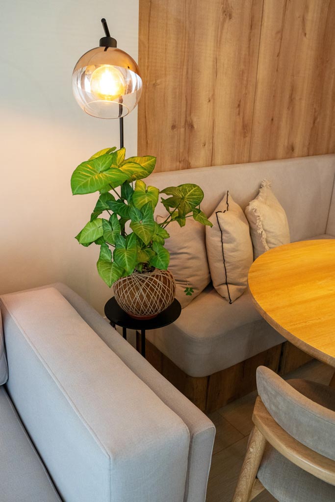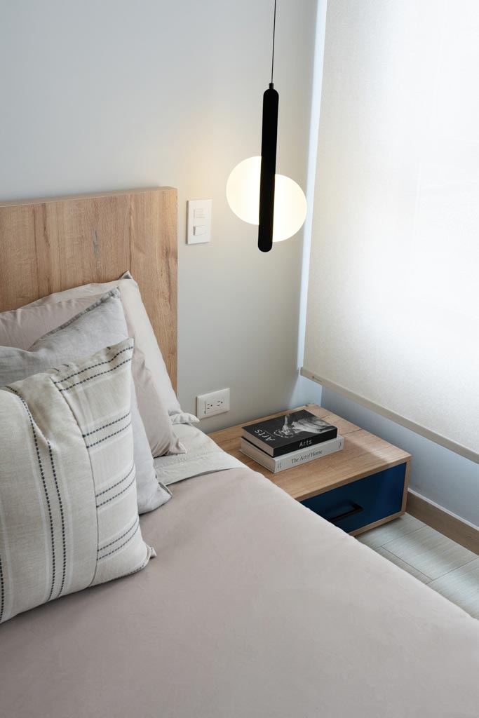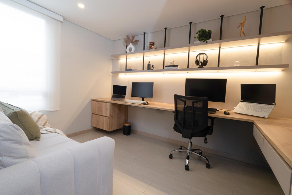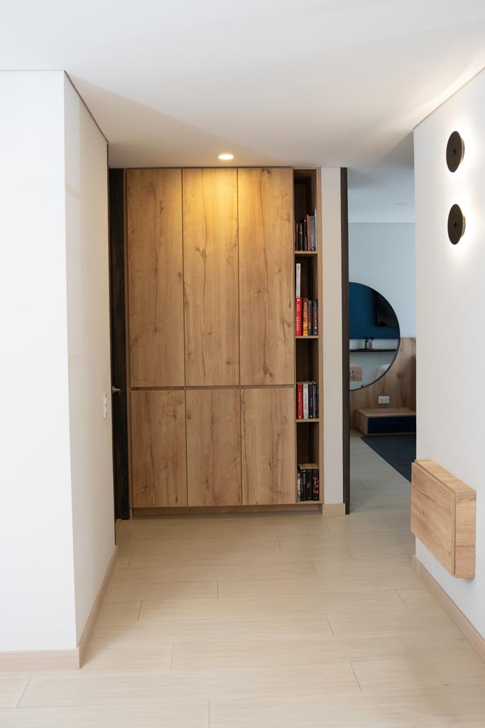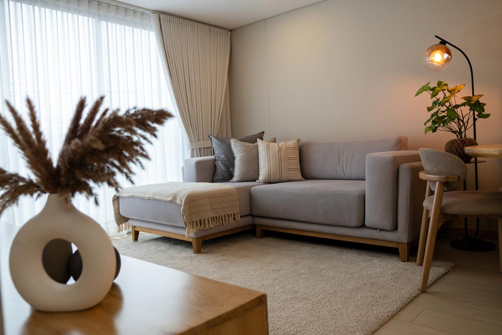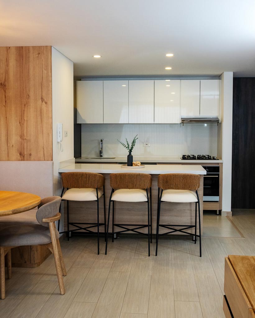 Este proyecto de diseño interior residencial fue creado para aprovechar cada metro del espacio, combinando funcionalidad y calidez. La luz natural se filtra suavemente a través de las cortinas, resaltando los tonos neutros y las texturas suaves del mobiliario. La madera natural en paredes y muebles aporta una sensación acogedora, mientras que los tejidos y cojines en lino completan una atmósfera relajada y hogareña. Un diseño pensado para disfrutar tanto los momentos de descanso como los encuentros cotidianos, donde la armonía visual se siente en cada detalle.