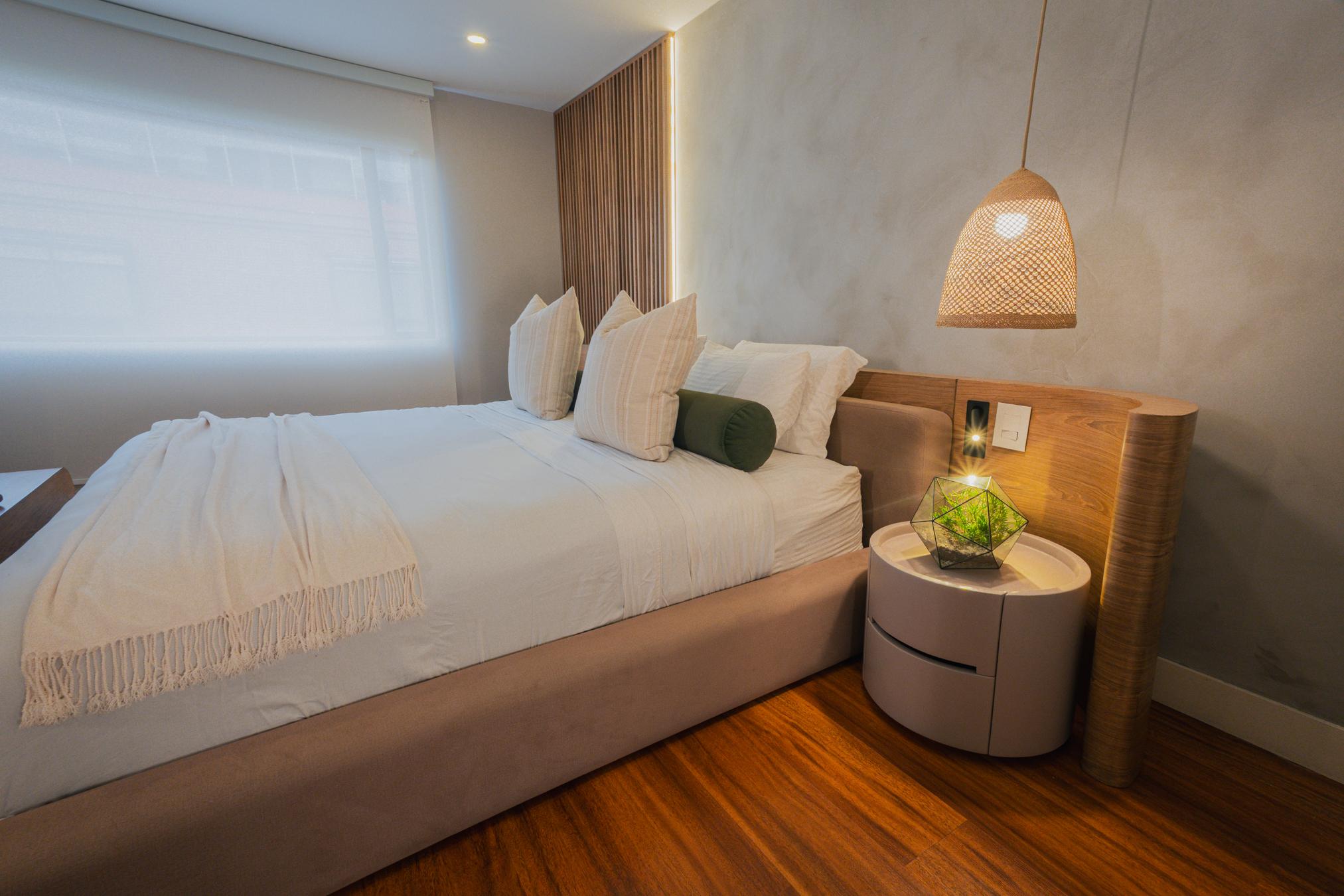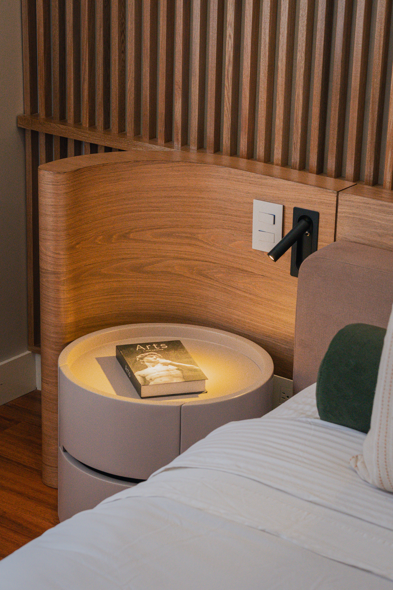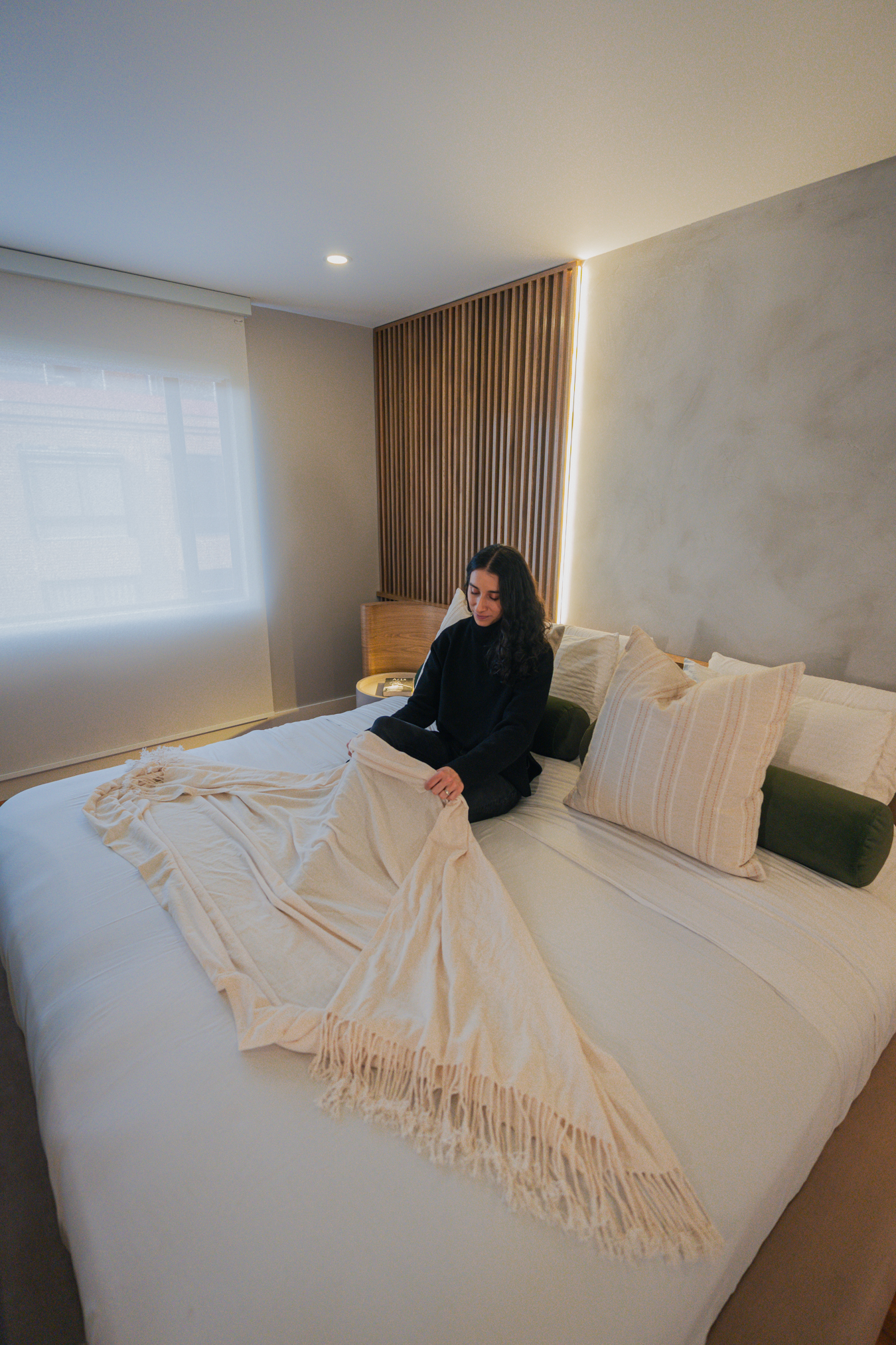 Este proyecto de habitación se concibe como un refugio sensorial donde la arquitectura interior y el diseño se integran para promover bienestar, equilibrio y calma. A través de materiales nobles como la madera, superficies minerales y textiles suaves, se construye una atmósfera cálida que conecta al usuario con su entorno. Desde un enfoque holístico, cada elemento —iluminación, mobiliario y composición— responde a la intención de generar una experiencia envolvente y armoniosa. El cabecero se convierte en un plano arquitectónico protagonista que aporta ritmo, carácter y luz indirecta sin saturar el espacio. La paleta neutra y la entrada de luz natural refuerzan la serenidad, creando un ambiente íntimo, atemporal y profundamente habitable.