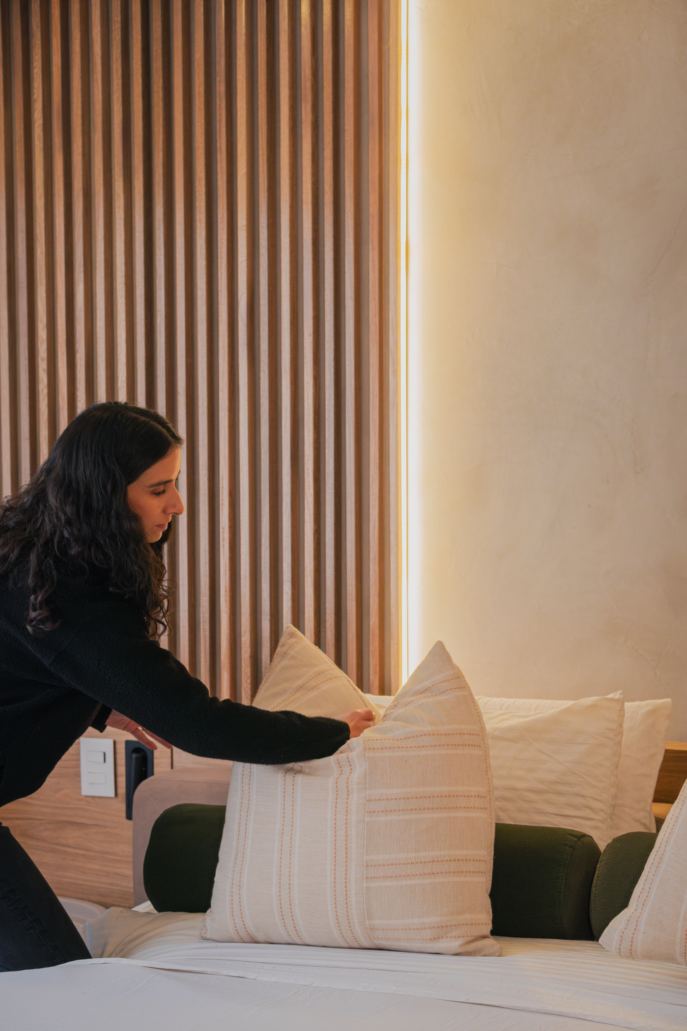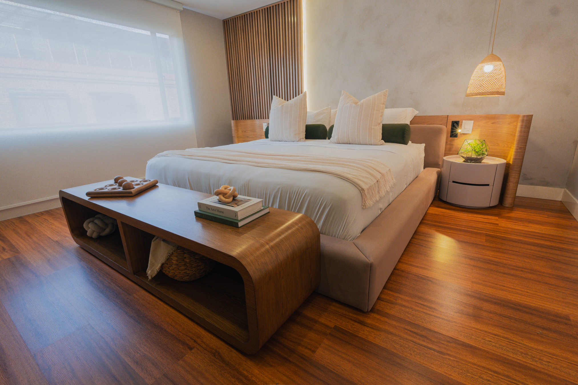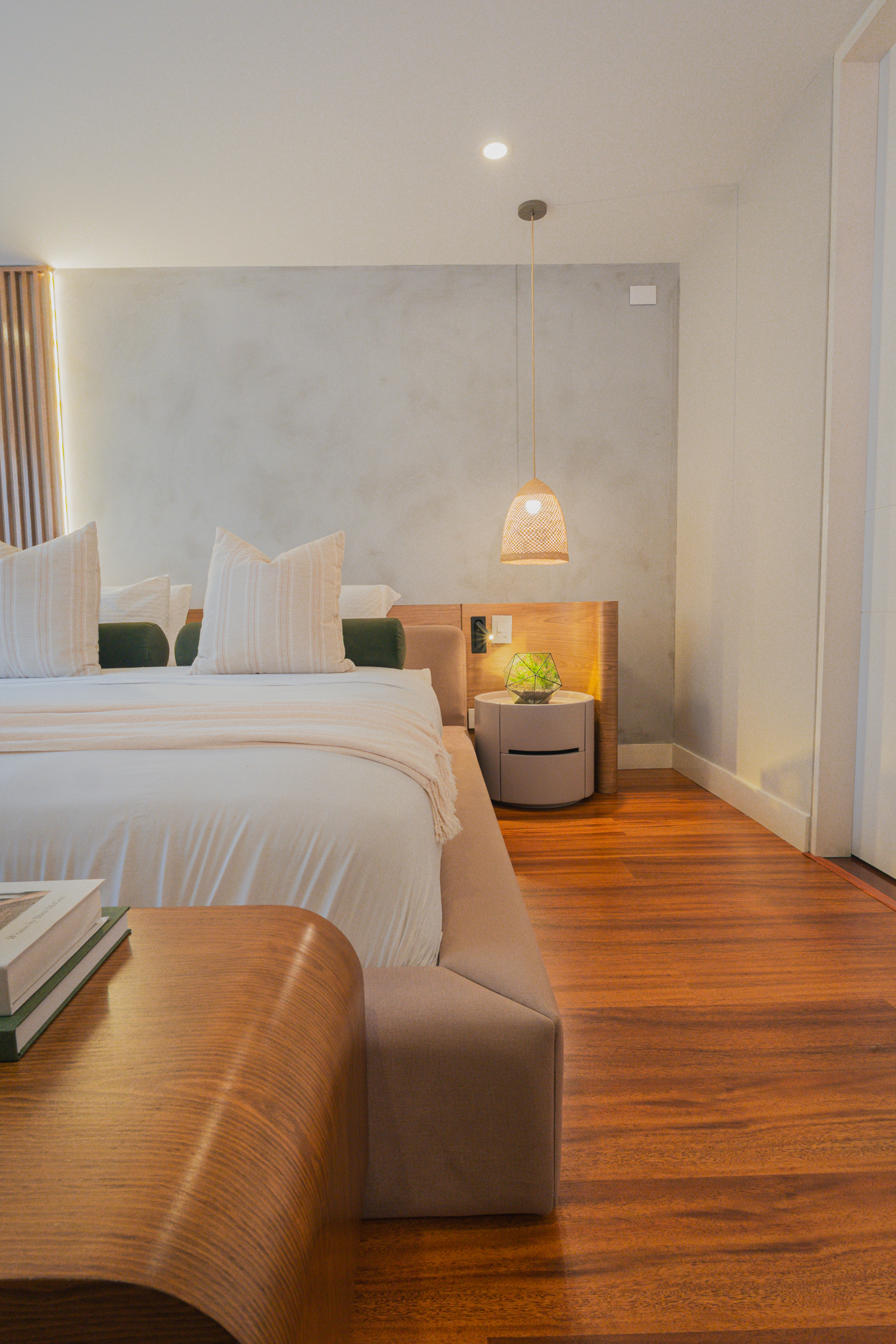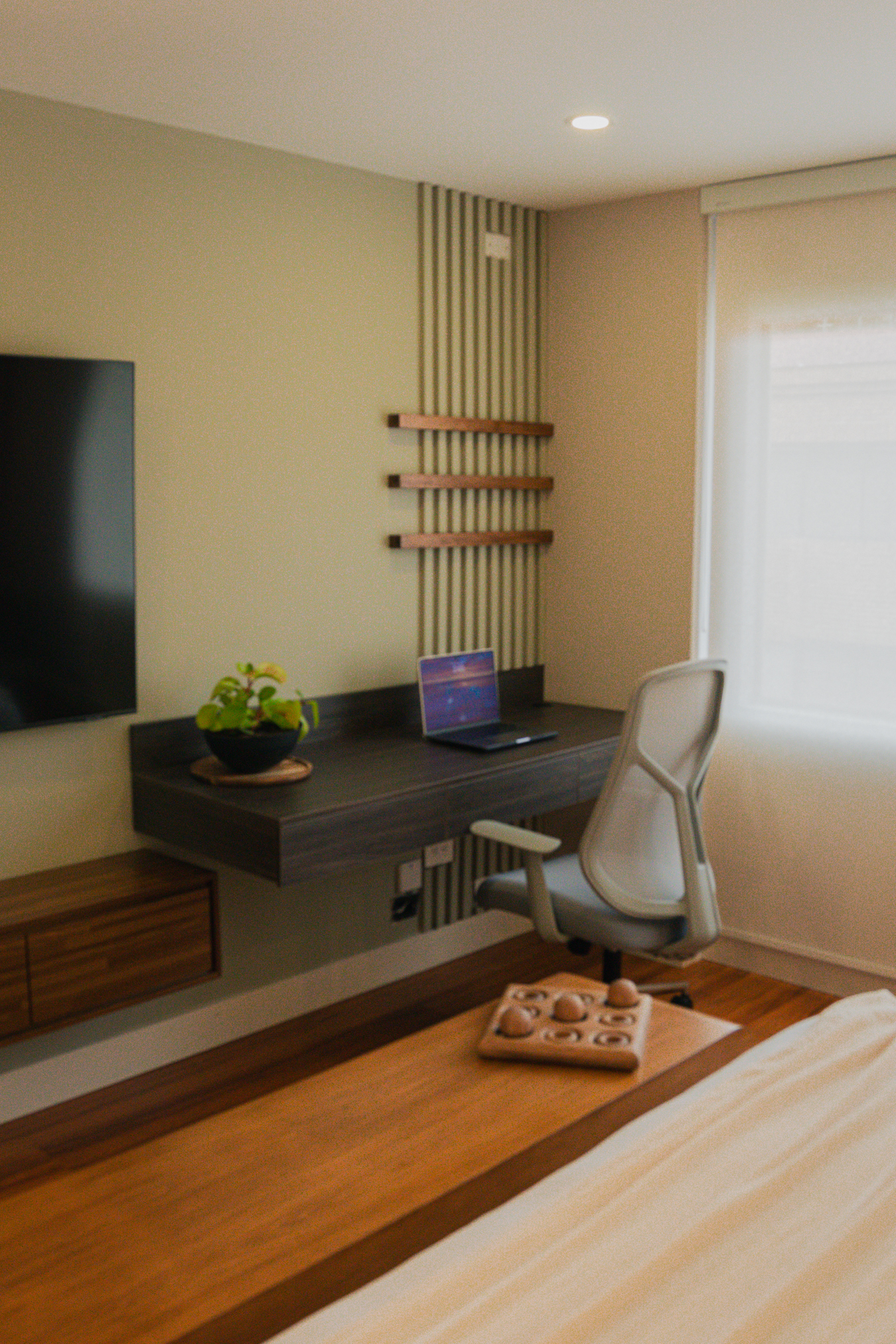 Este proyecto de habitación se concibe como un refugio sensorial donde la arquitectura interior y el diseño se integran para promover bienestar, equilibrio y calma. A través de materiales nobles como la madera, superficies minerales y textiles suaves, se construye una atmósfera cálida que conecta al usuario con su entorno. Desde un enfoque holístico, cada elemento —iluminación, mobiliario y composición— responde a la intención de generar una experiencia envolvente y armoniosa. El cabecero se convierte en un plano arquitectónico protagonista que aporta ritmo, carácter y luz indirecta sin saturar el espacio. La paleta neutra y la entrada de luz natural refuerzan la serenidad, creando un ambiente íntimo, atemporal y profundamente habitable.