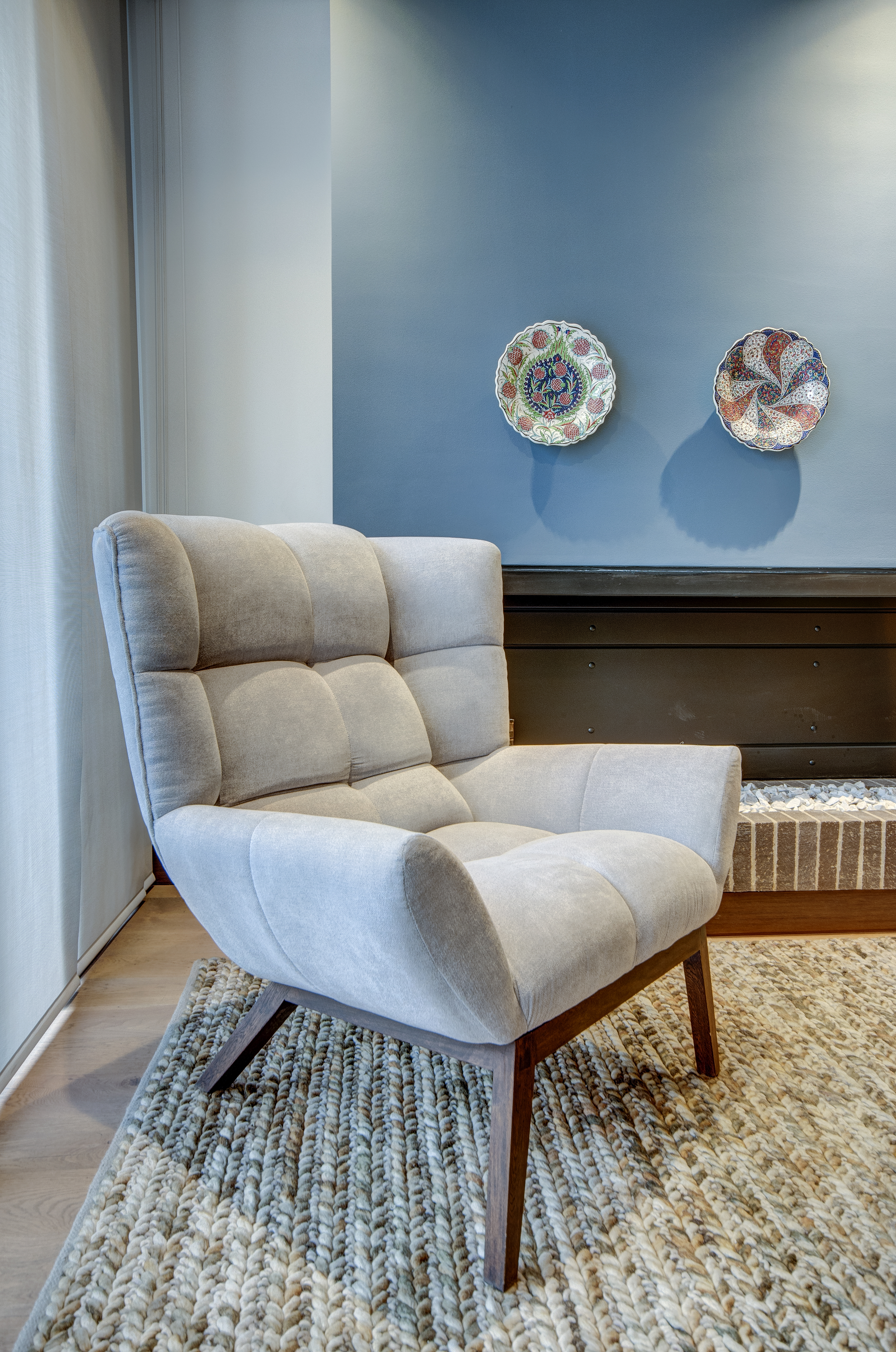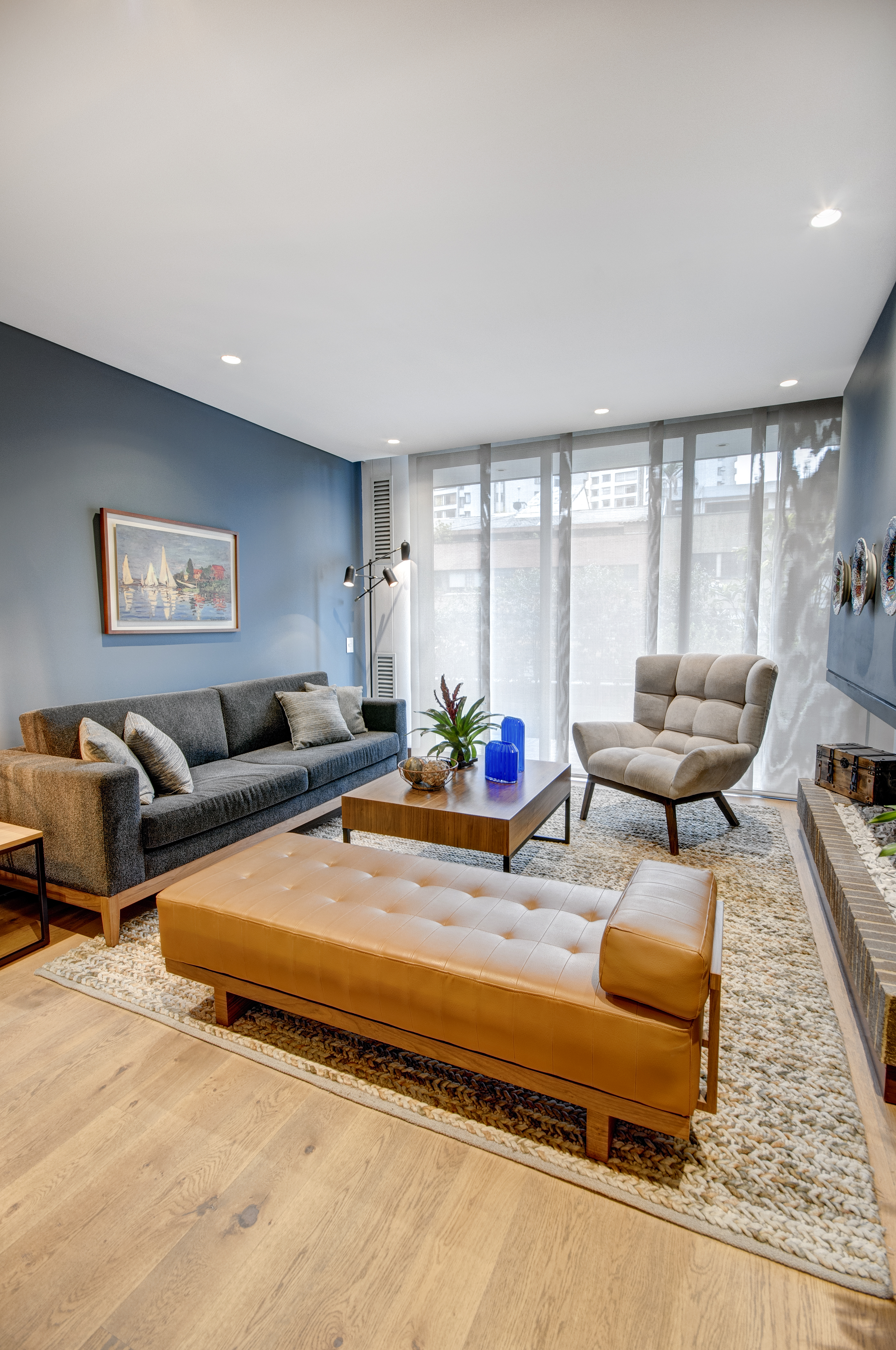 La propuesta cromática se basa en una paleta de tonos neutros cálidos, combinada con un muro acento en azul profundo que aporta carácter y profundidad visual. La madera natural, los textiles claros y la iluminación cálida refuerzan la sensación de confort y equilibrio, dando como resultado un espacio atemporal que refleja el enfoque de @minn.col: diseñar interiores que se adapten a las rutinas y al estilo de vida de quienes los habitan.